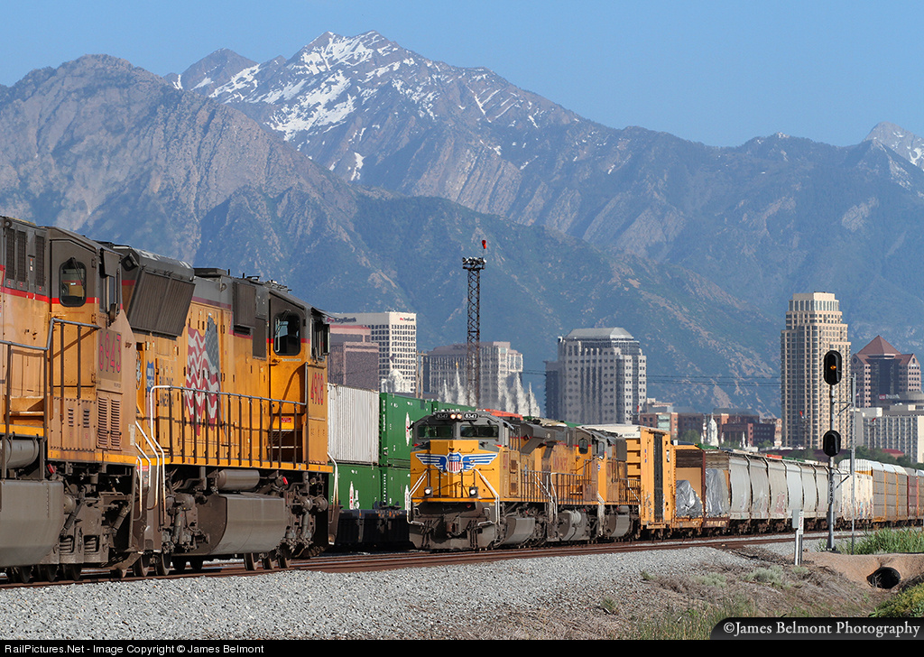 A busy moment is captured at UP North Yard in Salt Lake City. The SCSLV Ringling Bros and Barnum & Bailey Circus train arrives on Main 3 while the ZLAAH intermodal and MWCNP general freight trains await a crew change and inspection on Main 1 and Main 2.