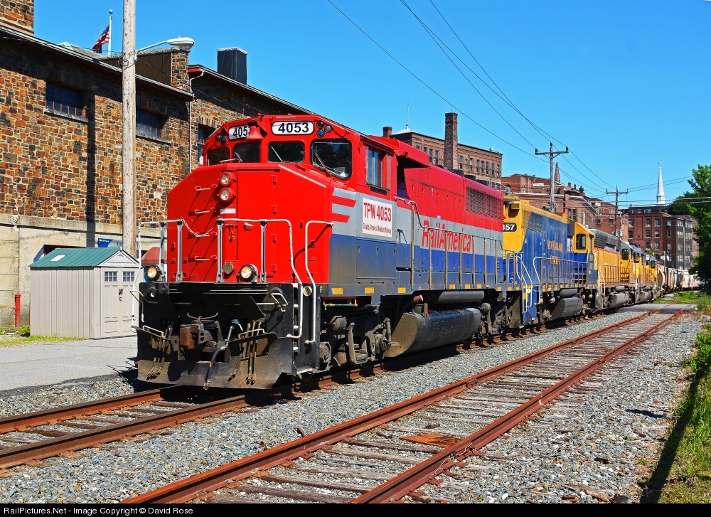 | TPW 4053 (GP40-2W), NECR 3857 (GP38AC), NECR 2680 (SD40-2), NECR 2714 (SD40-2), NECR 721 (SD40-2) with 102 cars pass the Amtrak station at Brattleboro.