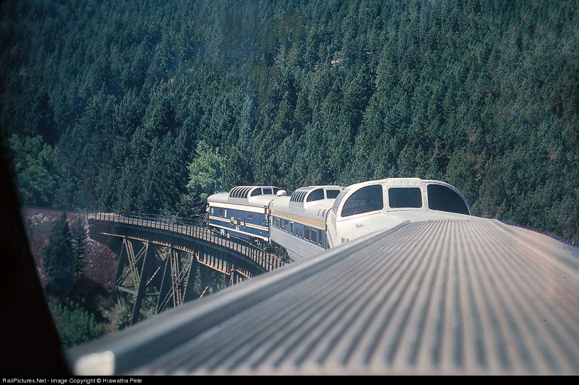 | On the eastbound 'Montana Daylight', crossing Austin Creek Trestle on the former Northern Pacific, now Montana Rail Link, mainline over Mullan Pass. Looking back at private car "Bella Vista" on the tail end. For more pics & video of this train see my web page on the Montana Daylight at http://northamericabyrail.info/usa-west/the-montana-daylight/ |