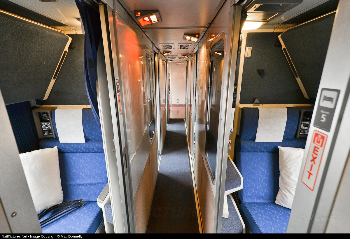 The interior of a Superliner II Sleeper, showing roomettes with the "Empire Rebuild" interiors that are the now current standard. It's quite a change from the 70's "Price is Right" interior colors the Superliner I's were delivered with. To compare with an overhauled Superliner I, Click Here