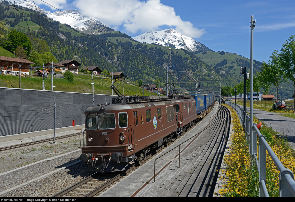 | Just a few minutes after my two previous posts a pair of BLS 'Brownies', Nos 190 'Raron' and 174 'Fruitigen' restart another LKW Walter intermodal train from one of the loop lines by Fruitigen station with a southbound train and descend the ramp to the Lotschberg Base Tunnel after being overtaken by an IC passenger service. |