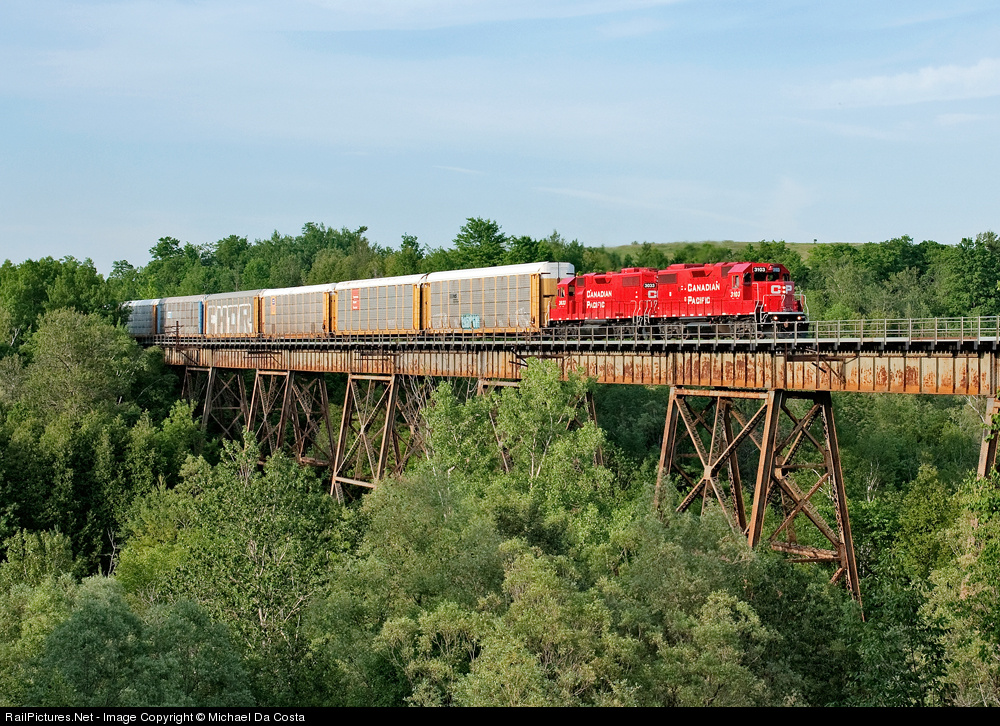 After waiting for an eastbound 2-240 to get out of the way at Oshawa, a pair of overhauled and repainted GP38-2's blast west through Cherrywood in notch 8 with loaded multi's from the GM plant. Well worth the wait from the plethora of mosquitoes trying to sucker in on this conductors blood.