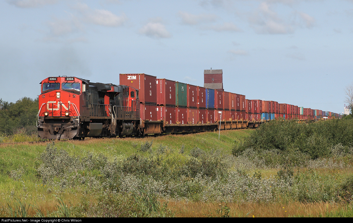 CN 2204 + CN 2319 team up pulling 146 platforms of US bound stacks past the former wheat king at Hubbard