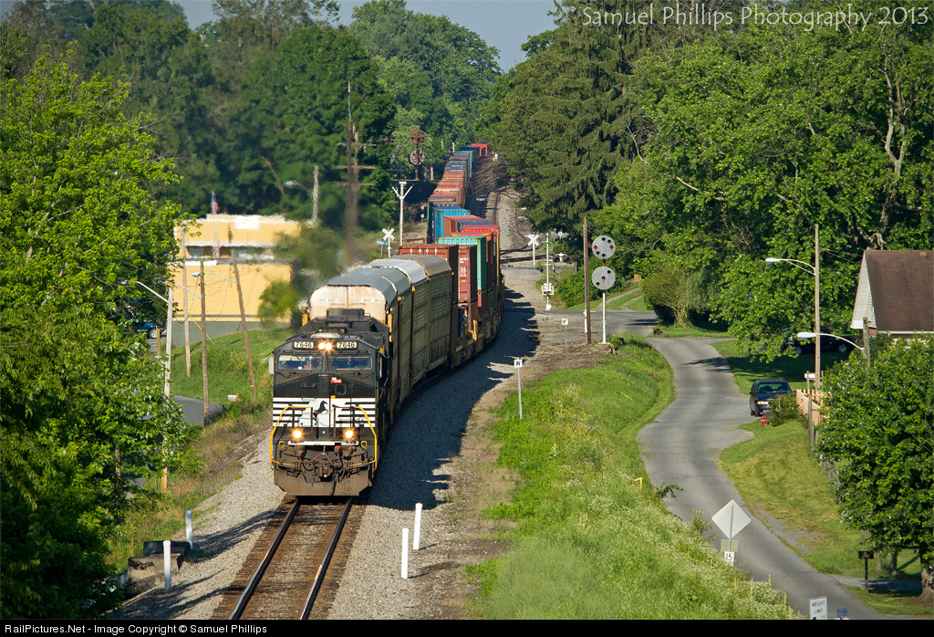 In beautiful morning light, the engineer on No. 23G throttles up the two GE's on the head-end of the train, after meeting opposing westbound 37Q at Glade Spring, Va., as the train prepares to make a fast run to Roanoke via the ex-N&W Pulaski District.