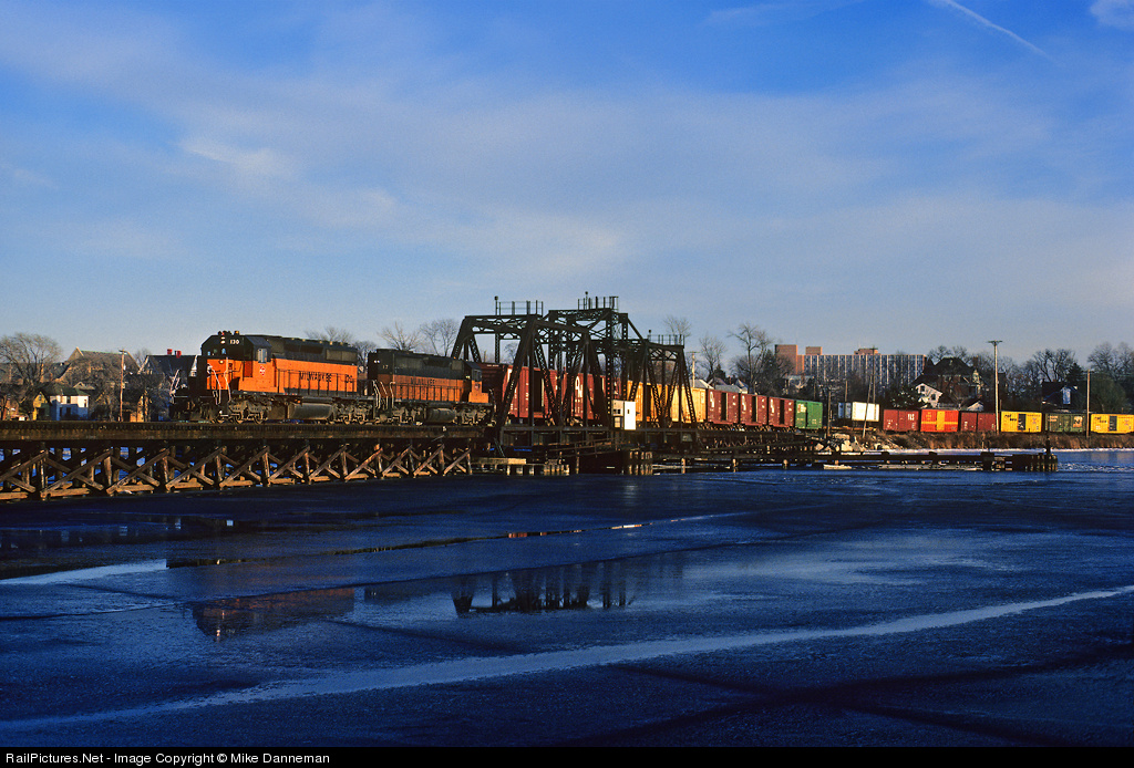A Milwaukee Road freight crosses the Fox River and enters Green Bay, Wisconsin, in December 1984. The Milwaukee to Green Bay train is powered by two EMD SD40-2s, Nos. 130 and 17, with the former in new “Hiawatha” paint.