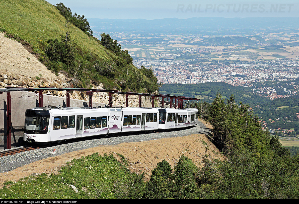 Since May 2012, a cog railroad leads on the 1465 metre high Puy de Dôme. The line is 5,3 kilometre long, the railcars were built by Stadler.
