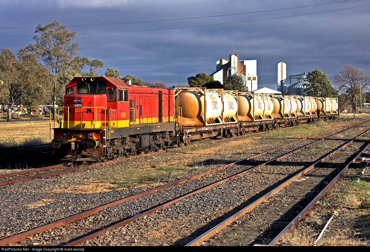 Stabled on the mill siding at Gulgong for the weekend G8C 4906 and its cement train welcome some sun after a freezing winters night, the flour mill in the background has been closed for many years.
