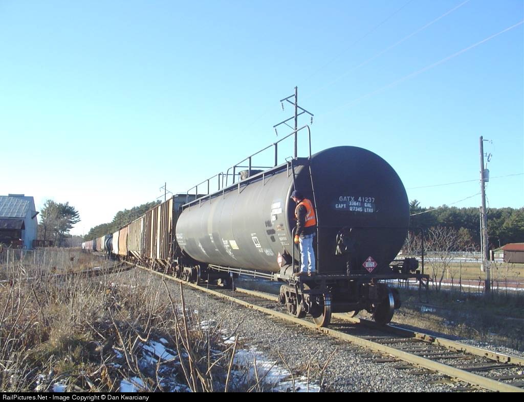 The conductor of YWU028-28 rides on the last car as they make their way to the West Yard.