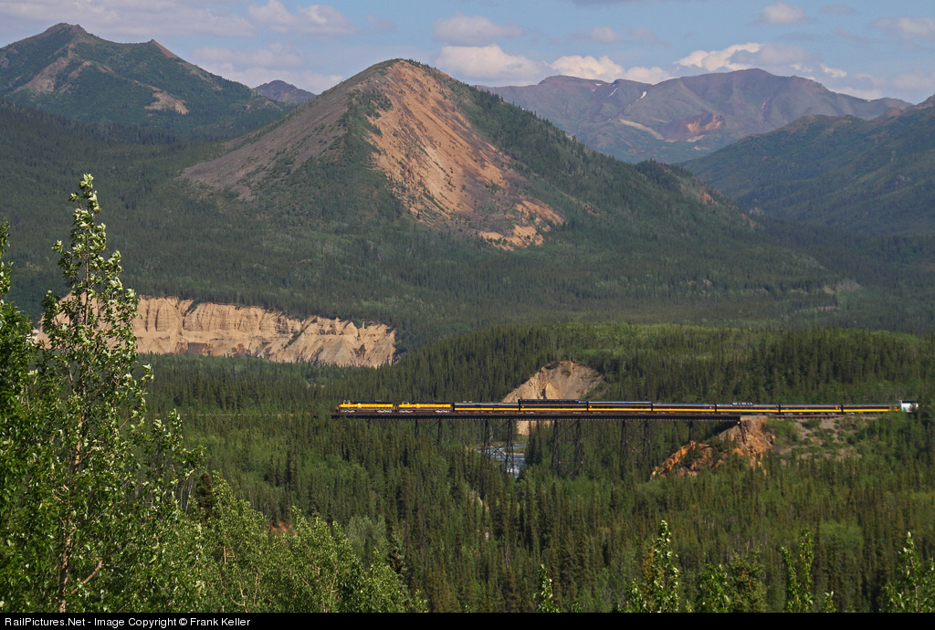 | The pride of the Alaska Railroad passenger service, the Denali Star crosses Riley Creek Trestle with the boundaries of Denali National Park. Upon crossing the trestle the train will arrive at the Denali Park station where numerous passengers will disembark to enjoy the park. This summer season has been truly fantastic here in Alaska. |