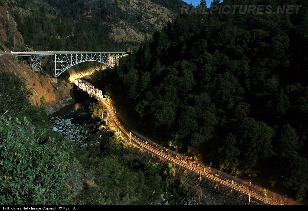 Hot Pulga nights. Well it wasn't actually so warm outside but the railroad action was hot in the Feather River canyon as the last few days of the Donner detours unfolded in the canyon. UP 7494 and mates have the eastbound Roseville, CA to North Platte, NE well in hand as they work their way through a moon lit Feather River canyon at Pulga. Here the former Western Pacific 3rd Subdivision, now UP's Canyon Subdivision, crosses over the Feather river while high above CA70 crosses river and railroad on an impressive steel bridge in a scene that has become a Feather River classic over the years.