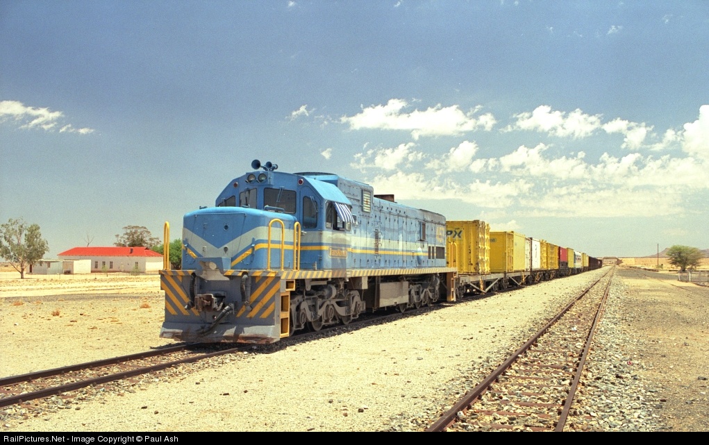 | The red roof of the general dealer, the blue TransNamib locomotive and a couple of yellow containers are the only splashes of colour in the sun-bleached landscape south of Karasburg, Namibia |