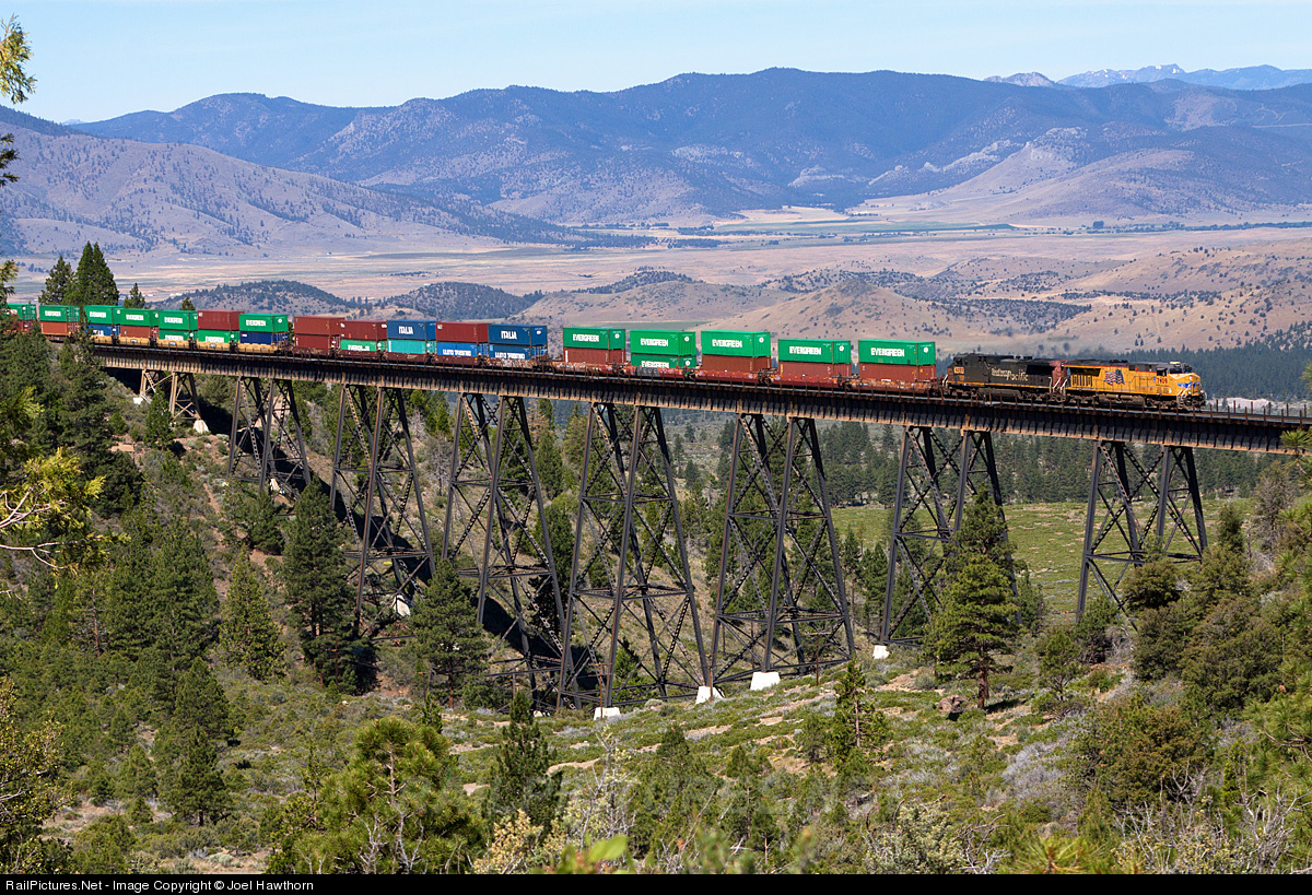 Northbound at the Dry Creek Trestle on the side of Mount Shasta, moving empty evergreen containers to Tacoma with a patched SP AC44CW.