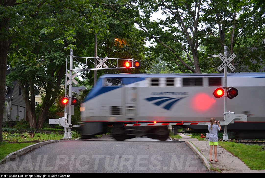 Amtrak train 688 cruises through the neighborhoods in Portland, ME as a young train watcher observes.