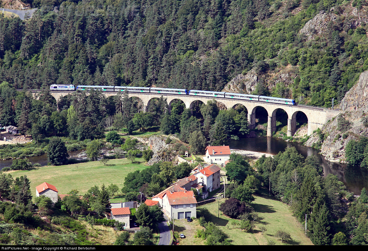 The tourist train through the Allier Canyon is crossing the viaduct of Chapeauroux