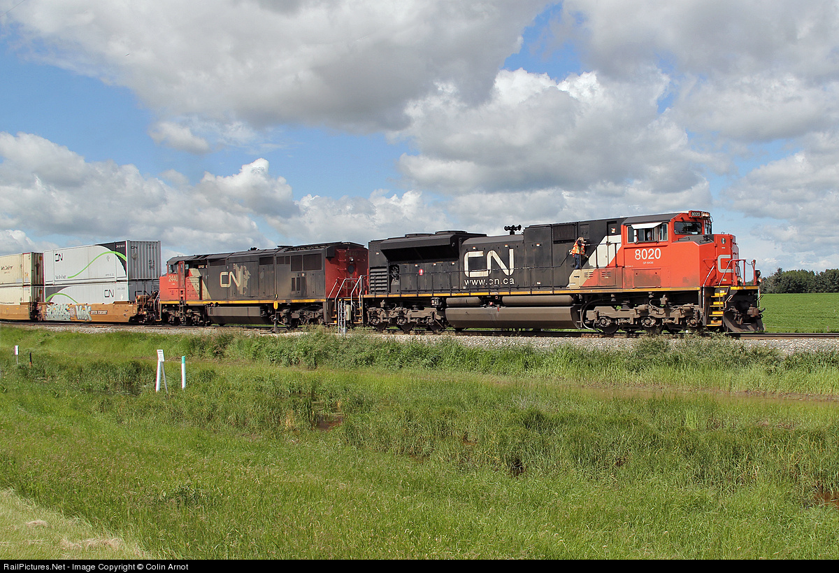 SD70m-2 8020 and DASH 8-40CM 2440 at Harris junction approaching Scotford Yard. This intermodal would normally run east on the Wainwright sub but was the third such train this morning to be diverted over the more northerly Vegreville sub to allow an engineering work window on its normal route