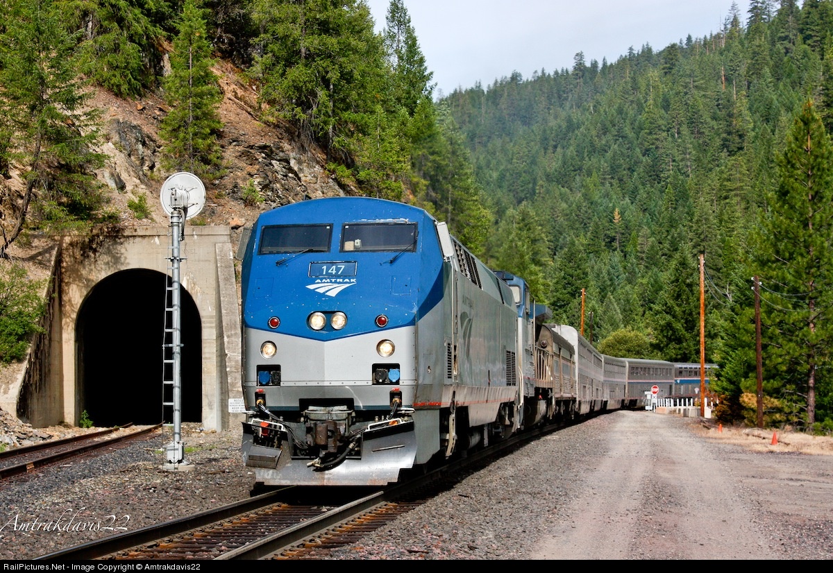 | After crossing the World Famous Keddie Wye bridges, the northbound Coast Starlight train highballs Keddie and heads for the BNSF Gateway Subdivision. Here it passes by the east leg of the Keddie Wye which is known as the "tunnel leg". Amtrak is making a rare appearance at this wye because of a large derailment that occurred near Dunsmuir on the Shasta Route. |
