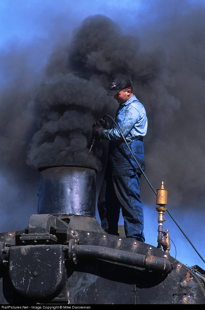 I’m thinking that cleaning the flues of a boiler on a steam wrecker goes to the low man on the seniority list! This young railroader uses high-presure air to blow out accumulated soot and grit from above right through the stack, but unfortunately has to deal with this same soot and grit right back at ‘em! Nevada Northern Wrecking Crane A is prepped for work at Lavon siding on the Adverse Branch north of East Ely, Nevada, on February 3, 2007. The crew here is performing a “derailment cleanup” with the steam crane as part of NN’s Winter Steam Spectacular weekend.