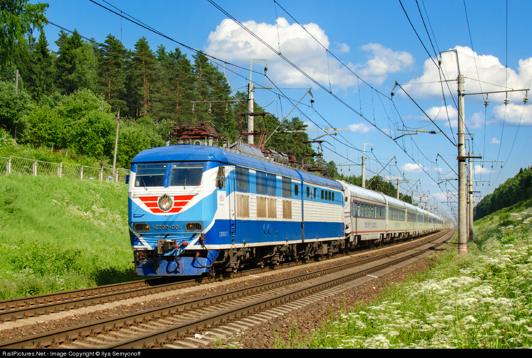 ChS200 locomotive with passenger train "Nevsky Express" runs from Moscow to Saint-Petersburg. ChS200 is a highspeed (maximum speed of 200 km/h (130 mph) electric DC passenger locomotive, made by "Skoda" for Soviet Union railways. Between 1979 and 1980 were built 12 locomotives used at the line between Saint-Petersburg and Moscow with highspeed trains. Nova days, "Nevsky Express" is the last highspeed (with speed over 120 mhp) train with locomotive traction in Russia. Such trains were dismissed from work some years ago and was replaced by Siemens Velaro trains "Sapsan". Currently, there are only 3 units of ChS200 used in operation. Externally ChS200 is similar to ChS6 locomotive.