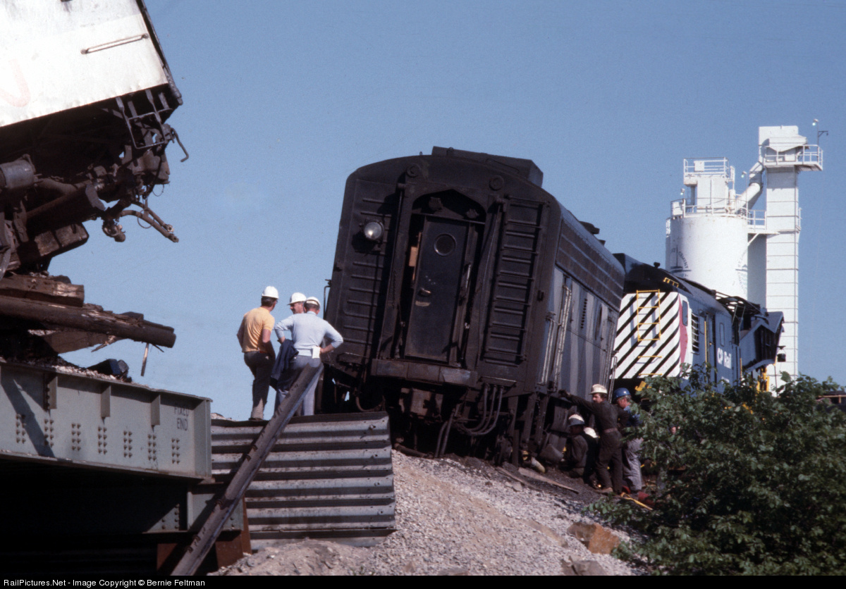 Canadian National F9B #6635, with the remains of the passenger train it was pulling in the foreground, is in the process of being rerailed by Canadian Pacific Wrecker #414479