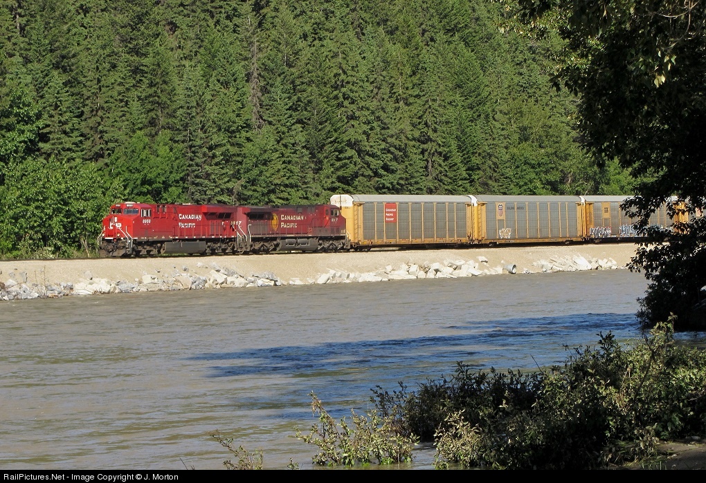 | CP 8950 leads its train slowly east along the swollen banks of the Bow River. Flooding which began June 20th, caused CP to close its line down between Calgary and Golden for almost 5 days. |
