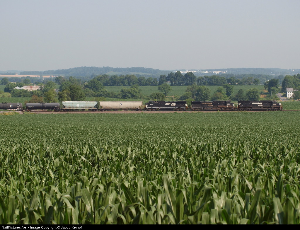 | The corn crop is approaching its normal height for this time of year in Berks County, but is still not high enough to block passing trains along NS's Reading to Allentown main. Here, three NS units lead a train of ethanol loads through the fields just outside of Alburtis on their way to unload in New Jersey. For a view from this spot in the fall, please click here. |