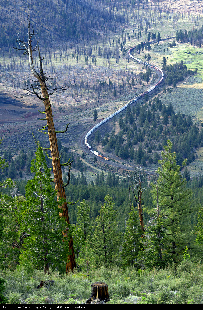 My take (re: Reed Skyllingstad's photo) of another BNSF train detouring down UP's Natron Cut-off. A semaphore-like old snag stands sentinel near the USFS fire lookout tower on the 5820' summit of Orr Mountain, CA. At 6:00pm, and 1400' below the snag, the train was setting up for a soon to occur meet with a northbound Union Pacific manifest.