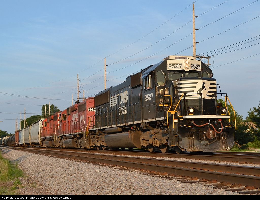 | NS SD70 2527, in fresh paint, leads CP 471 west down 2 main during the golden hour. |