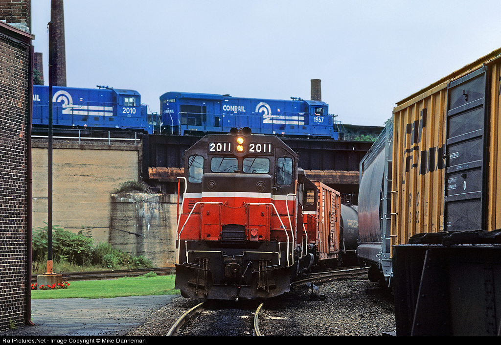 A Providence and Worcester freight pauses at the yard office at Worcester, Massachusetts, on July 27, 1986. Rumbling overhead is an eastbound Conrail freight on the Boston and Albany line through town, led by GE B23-7 No. 1967. P&W EMD GP38 No. 2011 is a former Conrail/Penn Central locomotive built in 1969.