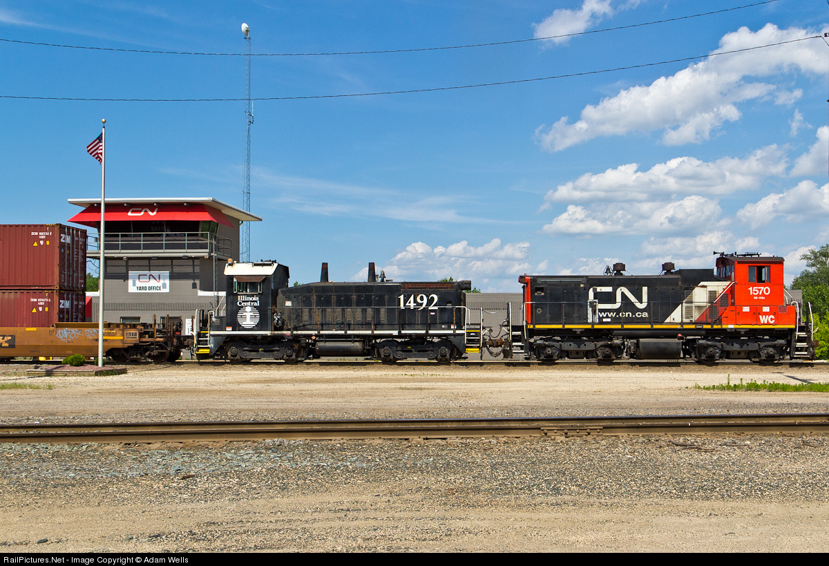 | A pair of rebuilt fallen-flag EMD switcher units, IC 1492 (SW14) and WC 1570 (SW1500), work the south end of CN's Shops Yard |