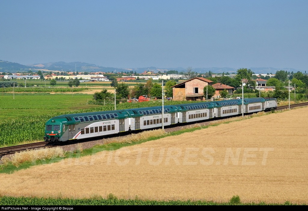 Double deck train for inter-regional service from Milano to Pescara passes through the cultivated fields in the province of Bologna.