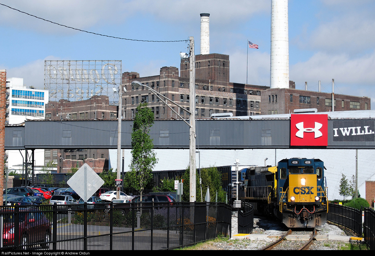 | Philly Sub local D732 rounds the loop at Locust Point with a long string of empties from the GE appliance warehouse at Belvedere. Domino Sugar's Baltimore refinery, also served by CSX, towers in the background. |