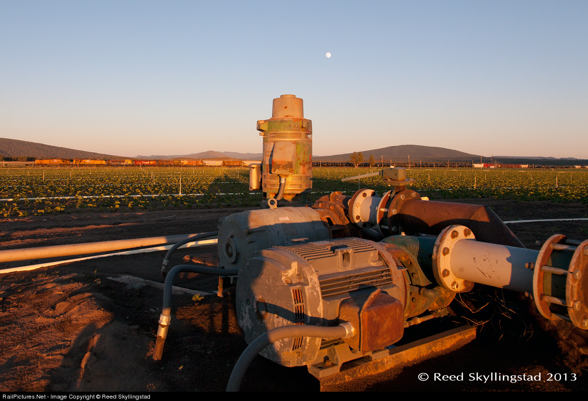 Happily humming, three large electric motors pump water to strawberry fields at sunset, while 12 larger electric motors power a northbound Union Pacific manifest train through Mt. Hebron, California.