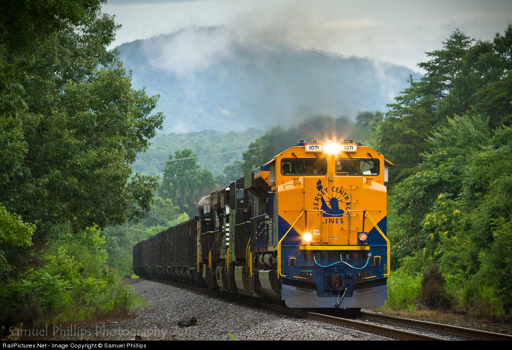 Blasting north with empty hoppers, No. 757 rolls into the community of Rocky Mount, Va., behind NS' Central of New Jersey heritage unit in command just after heavy rain had passed through.