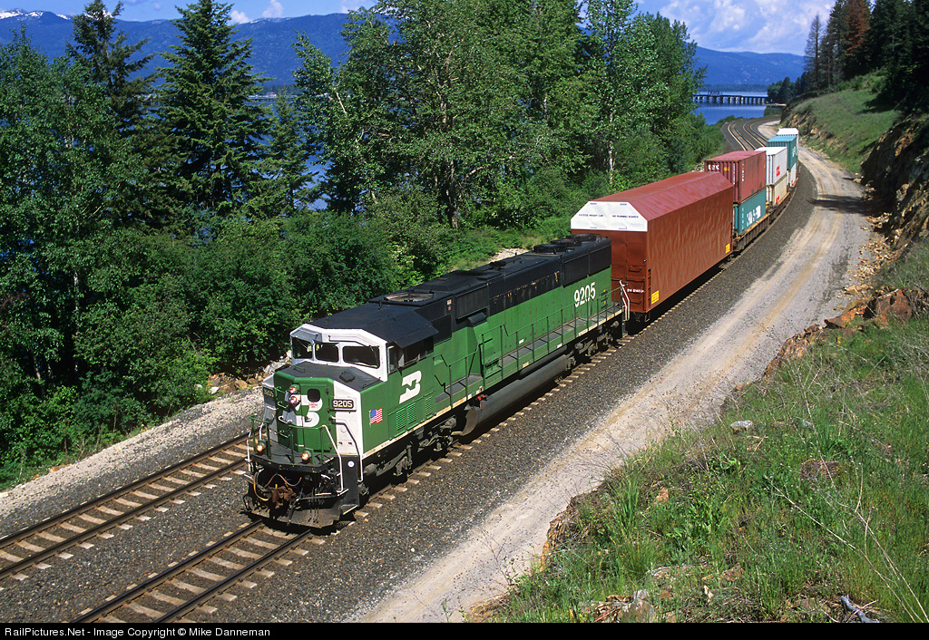 A Burlington Northern Santa Fe Boeing special is at Algoma, just across Lake Pend Oreille from Sandpoint, Idaho, on June 3, 2002. SD60M No. 9205 hustles the a lone Boeing parts car, along with with a four-well stack car (perhaps for braking) west towards Puget Sound.