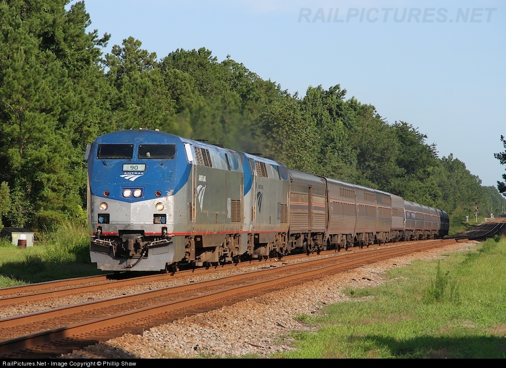 | A beat'n and brused number 90 leads the northbound Silver Meteor through Hilliard FL. about 25 minutes north of Jacksonville FL. |