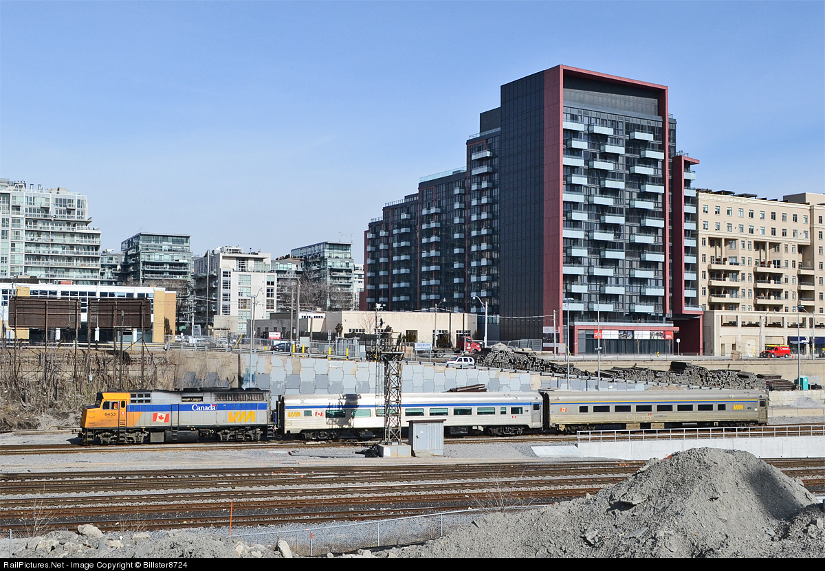 | Blast from the past! A classic F40PH-2 leads VIA 85 out of Toronto bound for Sarnia. All of these F40's have been rebuilt, and now wear a green "Renaissance" livery. The yellow F40PH era is no more. |