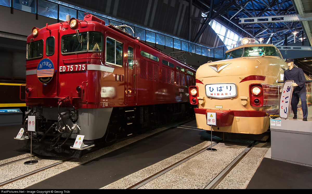 Two of the magnificent exhibits of the "Railway Museum" (Saitama). On the left electrolocomotive ED75 775 (Bo'Bo', 67 tons) built by Toshiba in 1975 and in service till 2007. The ED75 were the first mass produced standard version of the AC electric locomotive of Japan (for 20000 V AC 50 Hz), built from 1963. On the left, Class Kuha 481 Electric Railcar (Series 485 Electric Multiple Unit), first AC/DC limited express EMU for through services between DC and AC electrified sections in both east (50 Hz) and west (60 Hz) Japan. Kuha 481 26 was built in 1965.