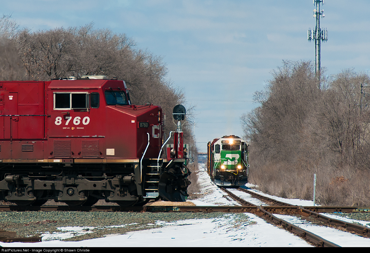 The Monti local lead by BNSF 1531 waits on a CP freight before heading back to Northtown with nine empties.