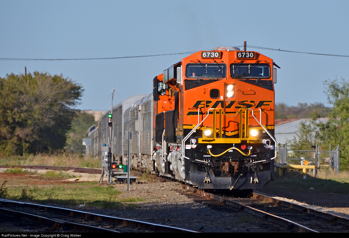 BNSF Railway train O-FTWFTW1-15A, a special for the Make-A-Wish Foundation, heads back to the Fort Worth and Western yard to spend the evening on October 15th, 2011. The train will return to the Fort Worth Stockyards to pick up passengers again the following day, with more Make-A-Wish specials. Power for these trains was a pair of General Electric ES44C4 diesels: 6730 and 6625.