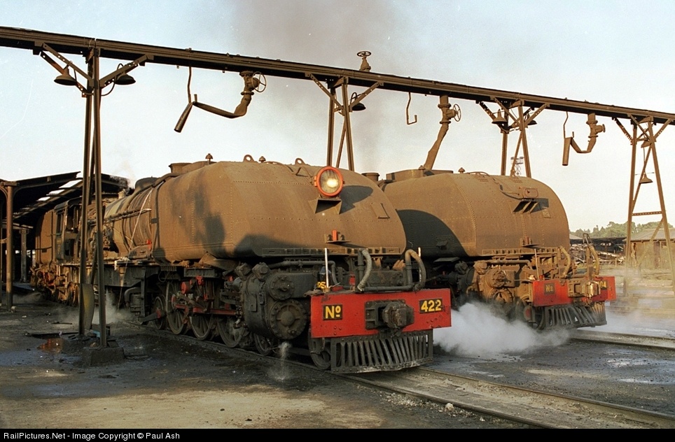 A brace of Garratts raise steam ahead of the day's work on the yards at Bulawayo, one of Southern Africa's key rail junctions. The engine on the right is a class 16A freight loco, the Garratt on the left is a class 15A passenger engine. Both locos still exist as of 2013.