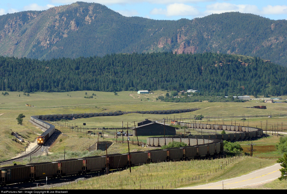 on the left a northbound BNSF coal empty has just come over the top of the Palmer Divide and is starting the fifty mile descent to Denver while on the right a southbound BNSF coal load has been waiting for it's turn over the top at the "Sag". Most southbound trains that will be held at Palmer Lake, the beginning of forty miles of single track stop here because in this short stretch the grade lessens do to the connecting of the exSanta Fe to the exRio Grande when this route became the Joint Line