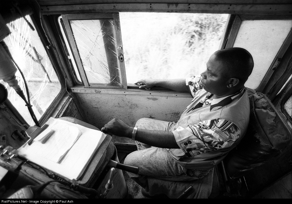 Engineer Felipe Mario at the thottle of a westbound freight on the privately-operated Norte Corridor line from Nacala port in Mozambique to the landlocked country of Malawi. The loco shows the grime and scars - flaking paint and cracked windshield, picked-up during a short but brutal life in the hands of state railway operator, CFM.
