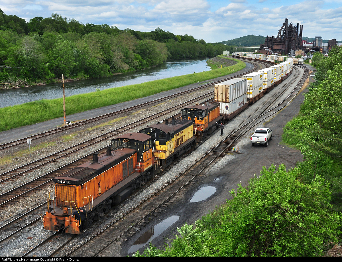 A very odd consist for 2013 made up of an MP15DC-SW7-MP15DC sandwich pull their double stack train to a stop as another employee hands off orders on the ground to the engineer.