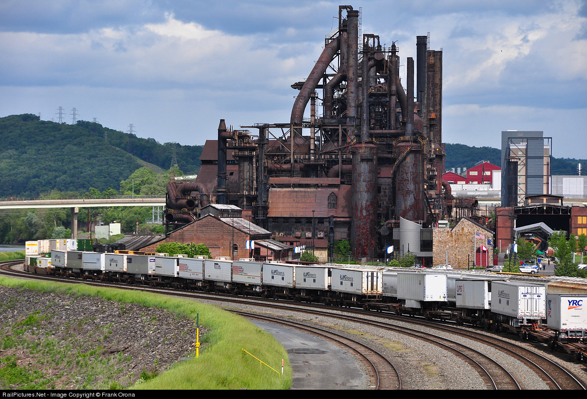 A piggyback section of NS 20K passes in front of the famous Bethlehem Steel blast furnaces as this intermodal comes to a stop in River Yard to break down its train.
