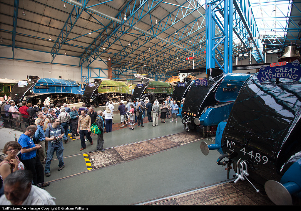A scene that hasn't been seen for about 50 years. Finally, all the six remaining A4s are gathered around the turntable at the National Railway Museum at York. 60007 Sir Nigel Gresley, 60008 Dwight D Eisenhower (on loan from Green Bay WI), 60009 Union of South Africa, 4468 Mallard (the fastest steam loco in the World at 126mph, 4464 Bittern and 4489 Dominion of Canada (on loan from Montreal). The crowds were at their lowest numbers when I took this wide angle shot. For most of the day, movement around the engines was very difficult because of the sheer numbers of people! Still, I saw this amazing sight.
