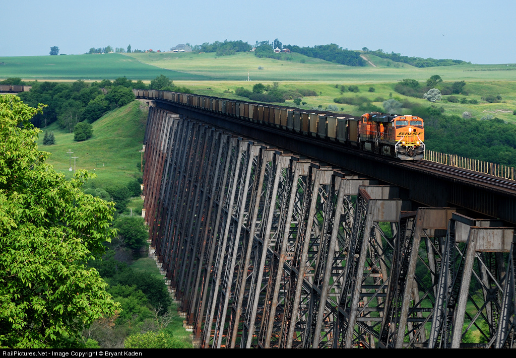 An eastbound coal train dodges some shadows as it traverses the Hi-Line bridge at Valley City, North Dakota.