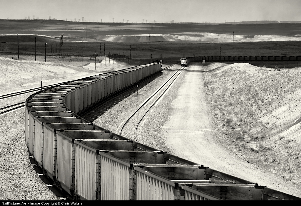 SD70ACe 9119 and ES44AC 6078 lead a northbound empty coal train down Logan Hill in Wyoming's Powder River Basin, as (behind the camera) SD70MAC 9945 and SD70ACe 9328 shove at the rear of the consist. In the distance, a southbound Union Pacific coal train climbs the grade.