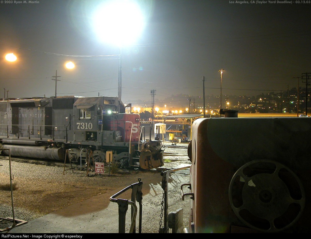 | As one of the rare SD40R's stenciled with non-standard sans serif "SOUTHERN PACIFIC" on the hood, SP7310 rests in the Taylor Yard deadline in the pleasant Southern California spring of 2003. |