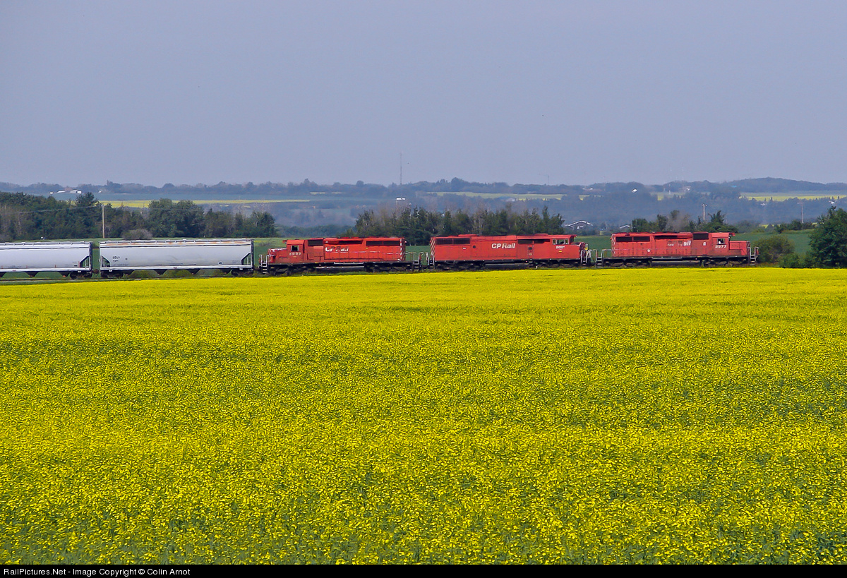 CP red seen across canola yellow in Strathcona County. A trio of SD40-2's 5977, 9001 (-2F "Red Barn") and 5999 take grain cars out to the elevator at Star.