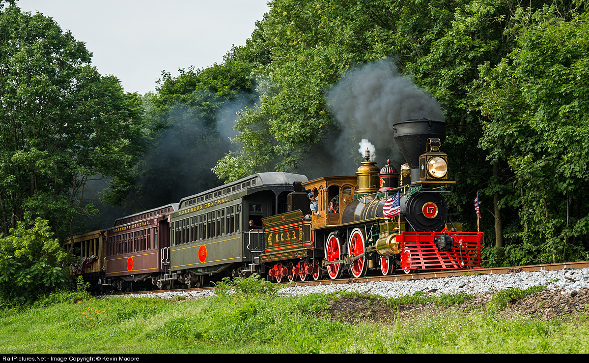 Here in my viewfinder, I behold a sight that I never thought I would live to see: A scratch-built, 1860s-era American Standard, pulling a passenger excursion in Pennsylvania. Three years ago, Steam Into History, a newly formed, non-profit organization declared that they were going to start such an operation and have it running for the 150th anniversary of the Confederate invasion of Pennsylvania. At the time, no one, including me, ever thought that anyone would be able to raise the cash to pull it off....but hell must be a pretty cold place right now. My eyes might deceive me, but my Nikon does not. Over the past three years, the money was raised and the Kloke Locomotive Works of Elgin, IL was engaged to build the machine. Delivered just a few weeks ago, just in time to meet the organization's goal, the new NCRY #17 "York" is now running 2-3 passenger excursions per day, 6 days per week, over 10 miles of track between New Freedom and Hanover Junction, PA. At the moment, the coaches you see behind the new engine are leased and you may recognize them as the cars normally pulled by the Tavares, Eustis & Gulf operation down in Florida. Within a few months Steam Into History plans to take delivery of at least 3 newly built cars that will be their own. These will be a little more period-correct-looking, and will have a very different paint scheme. This new operation has more ambitious plans. Getting that beautiful engine under cover is their most immediate concern, and near-term plans are in place to build quarters for the locomotive right next to their headquarters in New Freedom. Longer-term plans call for construction of "Armstrong", gallows-type turntables at both ends of the line, so the engine can face forward while running in both directions.